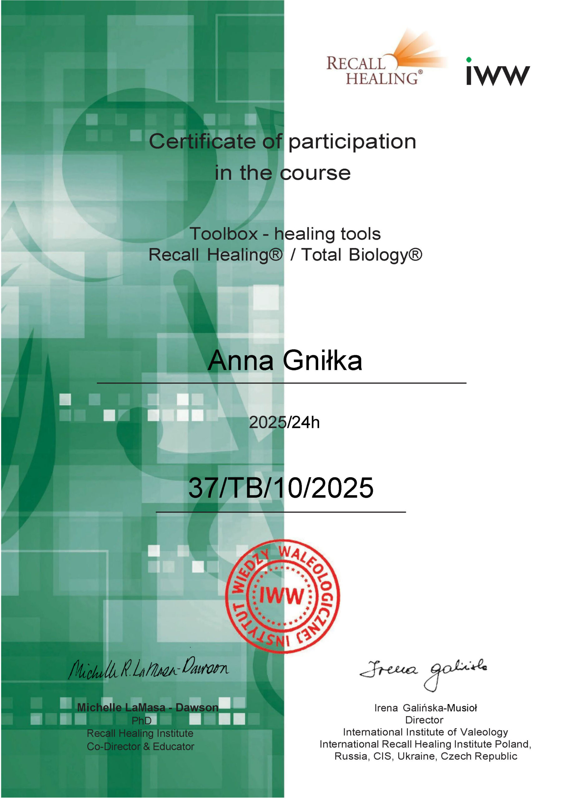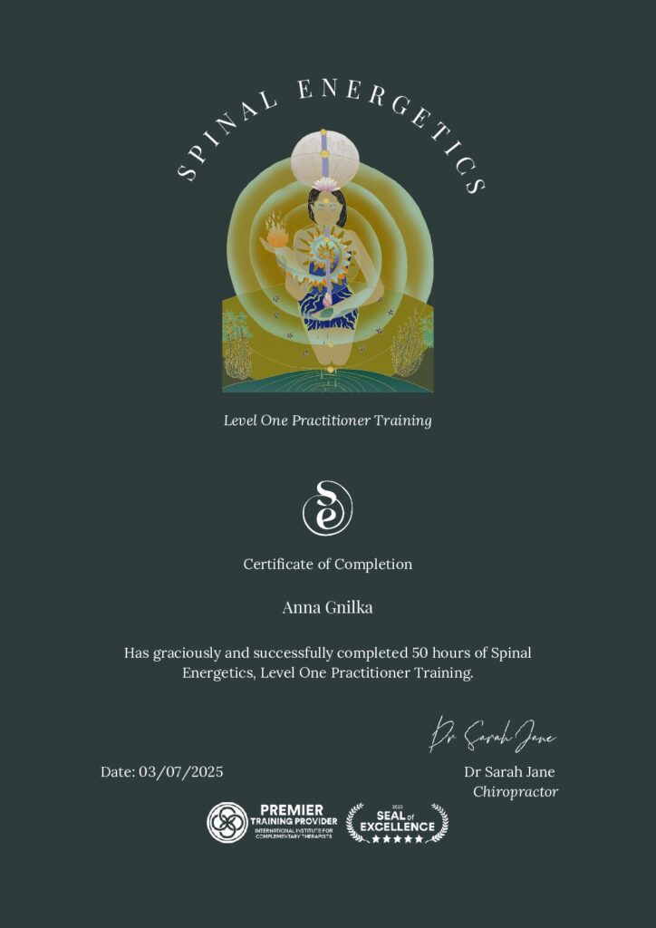 Dziś w swojej pracy łączę wiele technik i nurtów terapeutycznych pomagających podejść do zdrowia holistycznie. Jestem dyplomowaną naturoterapeutką, akupunkturzystką, terapeutką medycyny funkcjonalnej. Ukończyłam amerykańską szkołę coachingu zdrowotnego Institute for Integrative Nutrition opartą na medycynie integracyjnej. Posiadam wykształcenie z zakresu Totalnej Biologii, która tłumaczy wpływ świadomości na nasze zdrowie. Jestem certyfikowaną terapeutką metody Somatic Embodiment oraz energetycznych technik regulujących układ nerwowy: Polarity, Spinal Energetics oraz Neo Emotional Release.