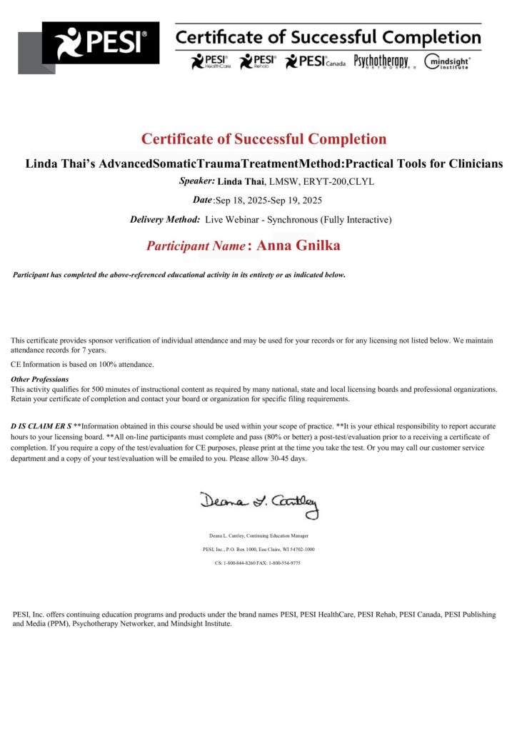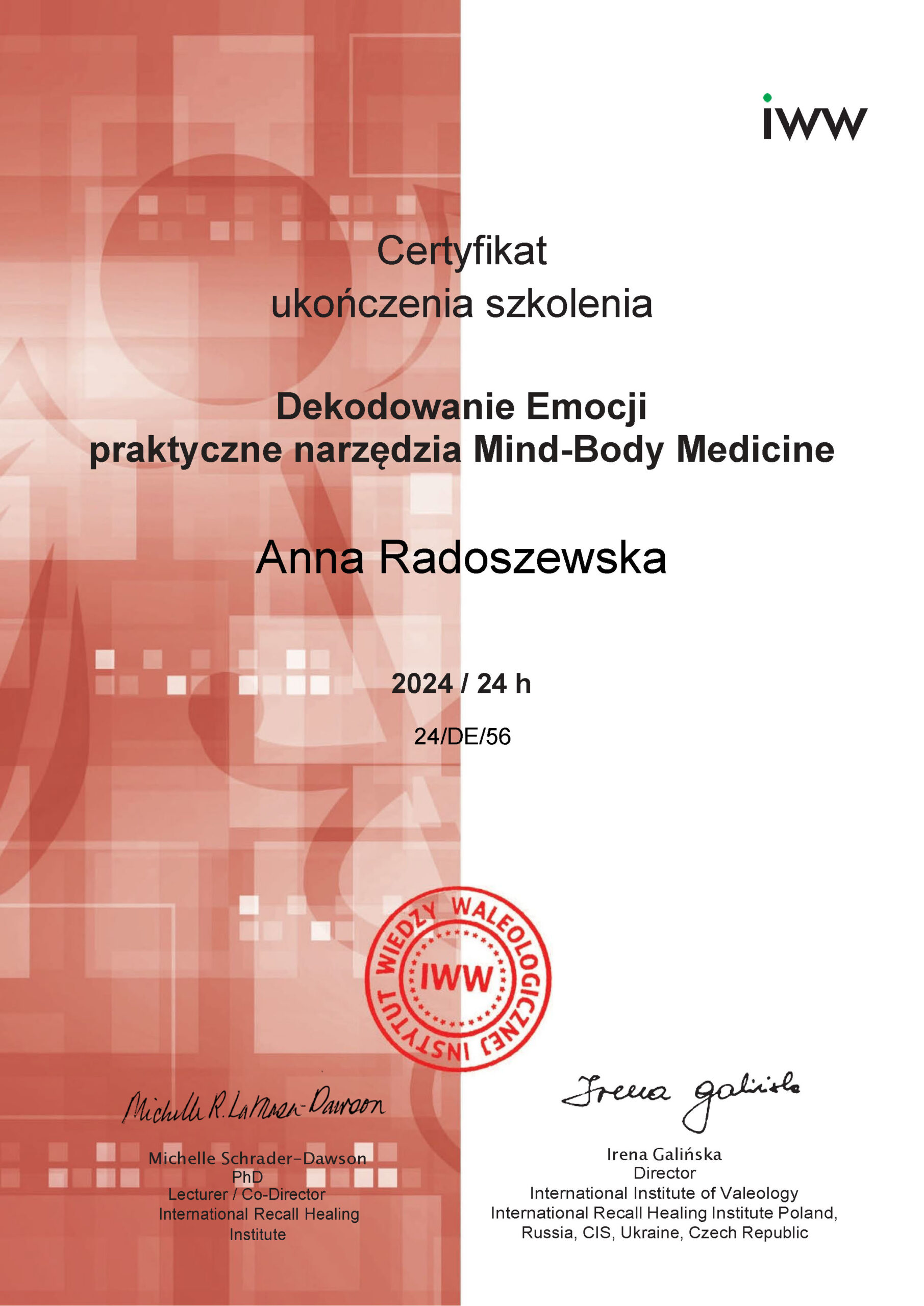 Jestem molem książkowym i kocham zgłębiać coraz to nowe obszary wiedzy. Nieprzerwanie kontynuuję edukację i doszkalanie się w zakresie fizjologii układu nerwowego, technik somatycznych, teorii traumy i uwalniania napięć z ciała.